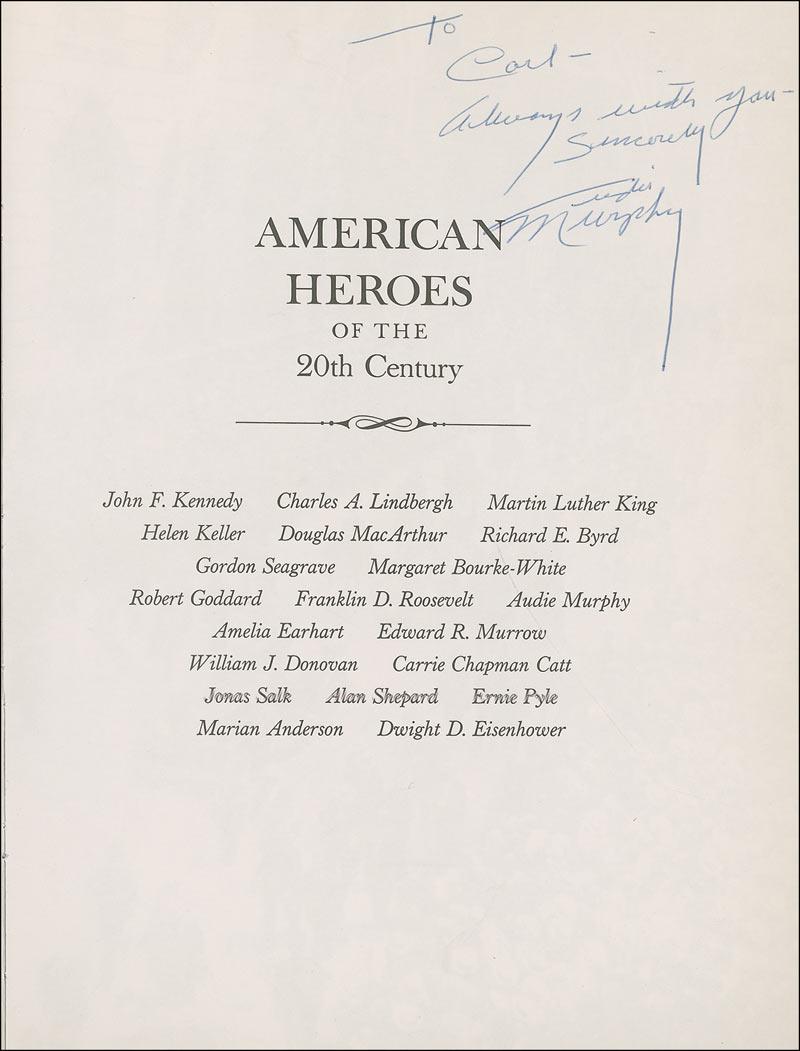 Signed book: American Heroes of the 20th Century. NY: Random House, 1967. Hardcover with dustjacket, 8.25 x 11.25, 179 pages. Signed and inscribed on the half-title page, “To Carl-Always with you, Sincerely, Audie Murphy.” Some light toning to covers, scattered toning and creasing to dustjacket, and price clip to inside, otherwise fine condition.