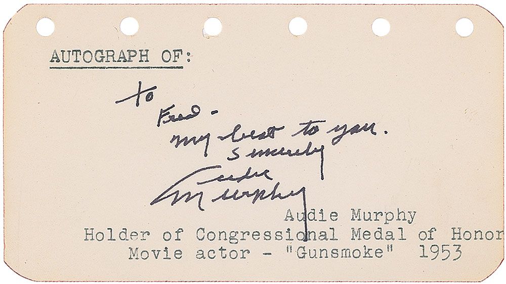 Vintage fountain pen signature and inscription, “To Fred—my best to you, Sincerely, Audie Murphy,” on an off-white 4.5 x 2.5 page. In fine condition.