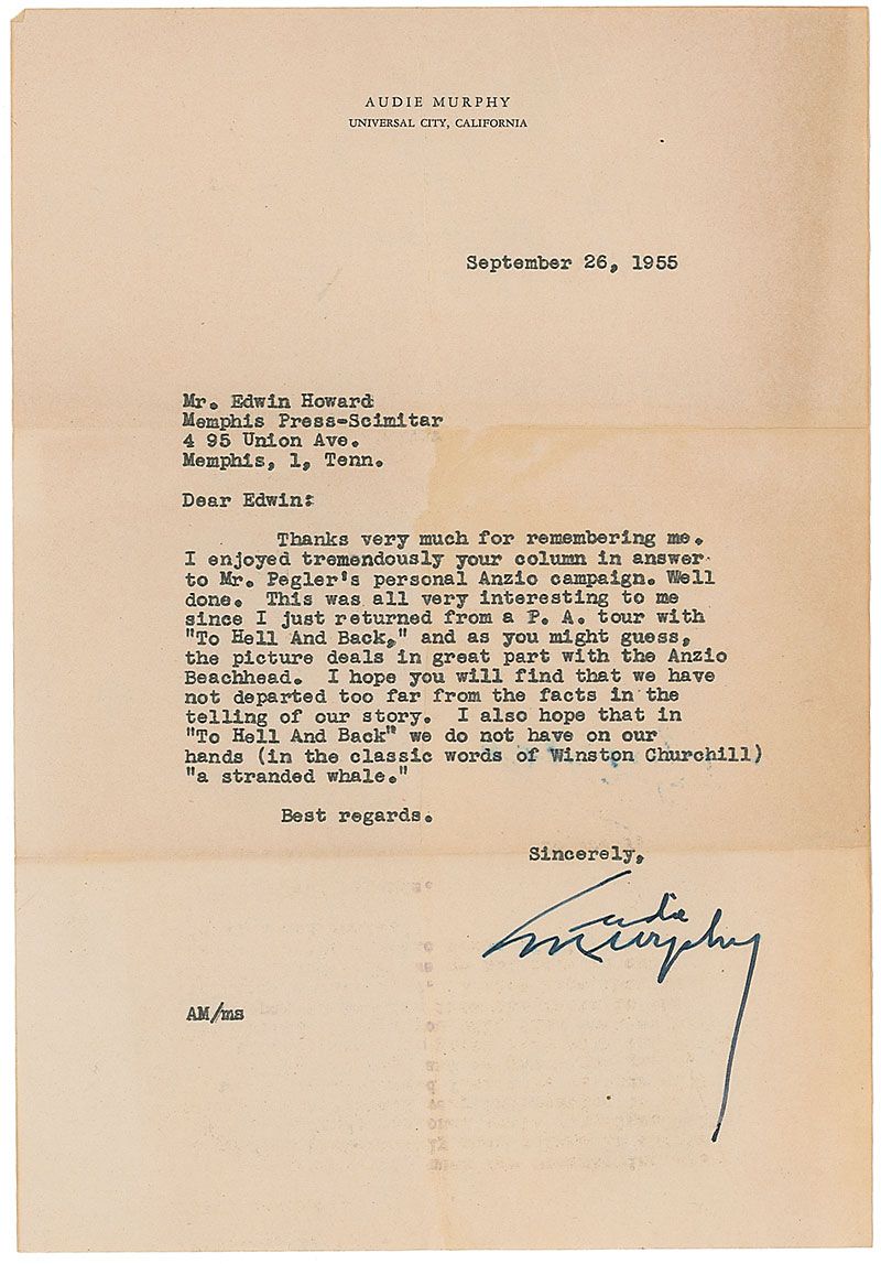 TLS, one page, 7.25 x 10.25, personal letterhead, September 26, 1955. Letter to arts and entertainment editor Edwin Howard. In part: “I enjoyed tremendously your column in answer to Mr. Pegler’s personal Anzio campaign. Well done. This was all very interesting to me since I just returned from a P. A. Tour with ‘To Hell And Back,’ and as you might guess, the picture deals in great part with the Anzio Beachhead. I hope you will find that we have not departed too far from the facts in the telling of our story. I also hope that in ‘To Hell And Back’ we do not have on our hands (in the classic words of Winston Churchill) ‘a stranded whale.’” In very good condition, with intersecting folds and scattered toning.