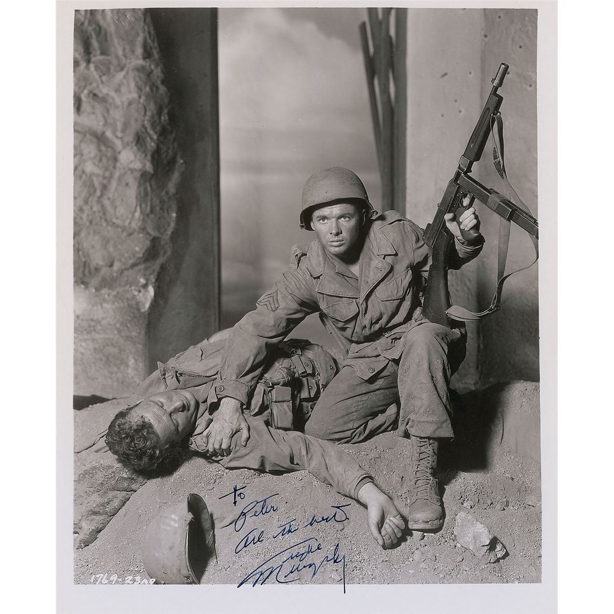 Classic vintage glossy 8 x 10 publicity photo for the 1955 film To Hell and Back showing Murphy next to a fallen soldier, signed and inscribed in fountain pen, “To Peter, All the best, Audie Murphy.” In fine condition. The film starred Murphy as himself and recounted his experience as a US soldier during World War II. It was an immense critical and commercial success, advancing Murphy’s acting career and elevating his stature as a national hero.