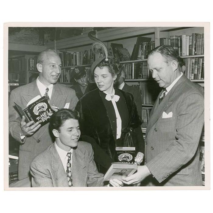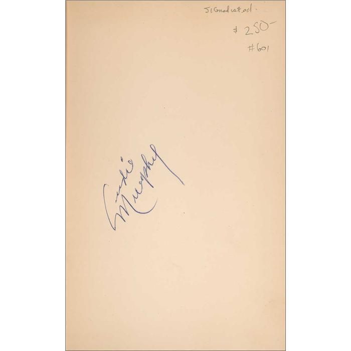 Signed book: To Hell and Back. First edition, first printing. NY: Henry Holt and Company, 1949. Hardcover with dustjacket, 5.5 x 8.25, 274 pages. Signed in blue ballpoint on the front free end page. Accompanied by a vintage photo of Murphy at a signing for the book. In very good condition, with toning, wear, and a few tears to jacket, partial separation to front hinge, slight wear to extremities, and a hint of mild toning to interior. Pre-certified PSA/DNA and RRAuction COA.