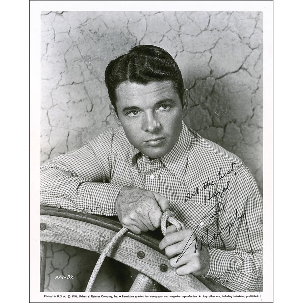 Vintage glossy 8 x 10 Universal publicity photo, signed and inscribed in black ink “All the best, Hazel, Audie Murphy.” Noticeable impression to background, and some other scattered light surface marks and impressions, none affecting the crisp signature, otherwise fine condition.