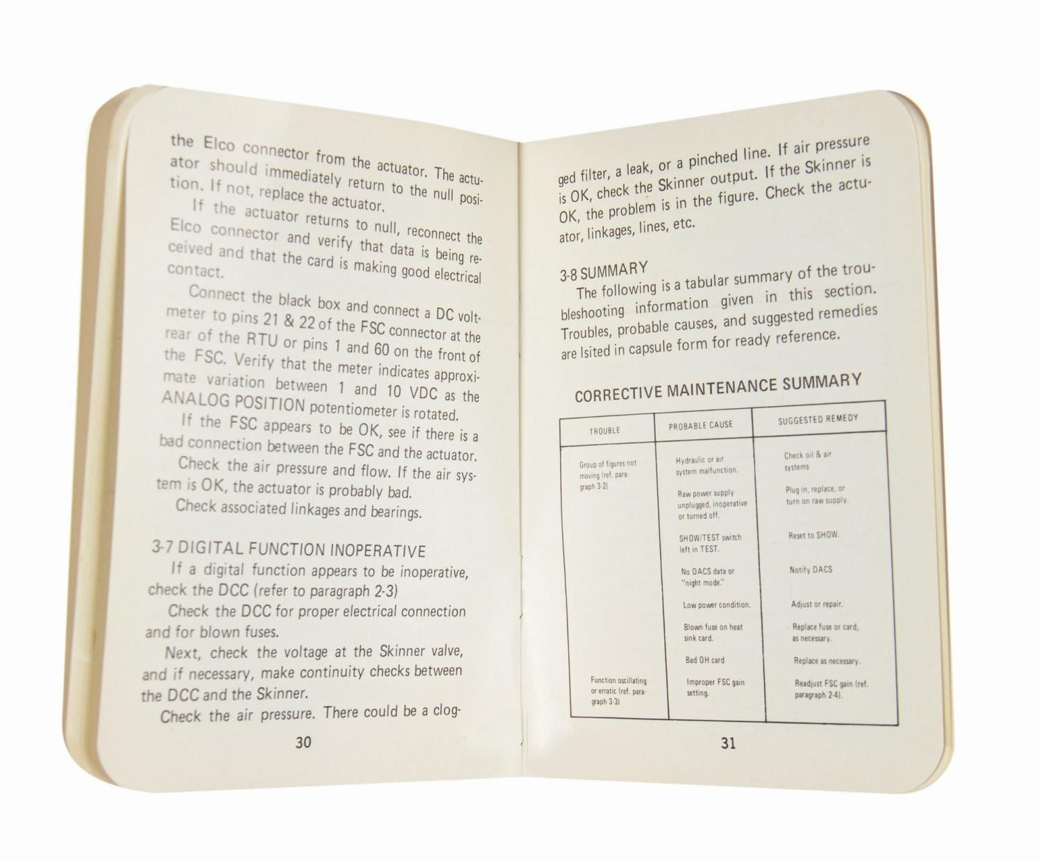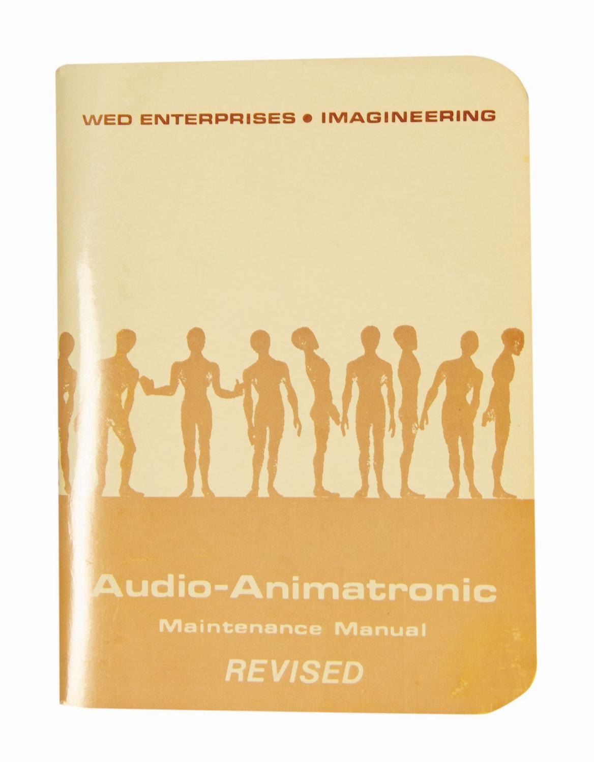 (Disneyland, 1978) A Revised Audio-Animatronic Maintenance Manual created by WED/MAPO Technical Publications for Imagineers and park cast tasked with maintaining the many audio-animatronic performers at Disneyland and Walt Disney World. The cardstock-bound 58-page manual contains guides to troubleshooting malfunctions in audio-animatronics, as well as extensive information on the construction, programming, and capabilities of the figures with detailed diagrams. The booklet provides a rare glimpse behind the scenes at one of the most magical elements of the Disney parks experience. Measuring 5"x3.75", the piece is in very good condition with minor surface wear and corner bends to the cover.
