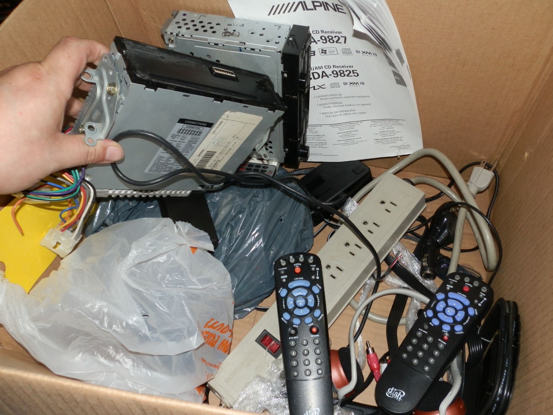 you get a JVC 7 disc changer, no speakers, Alpine cd deck for the car, with detachable face plate, Toyota tape deck, computer hardware, carbon monoxide alarm, power bar and lots of audio video cords...used