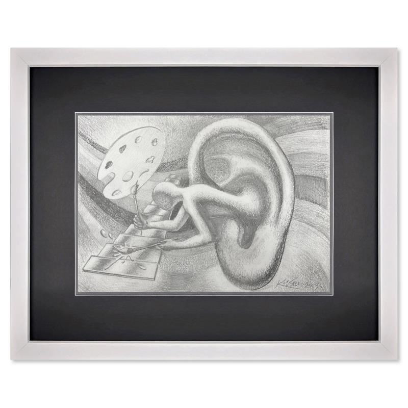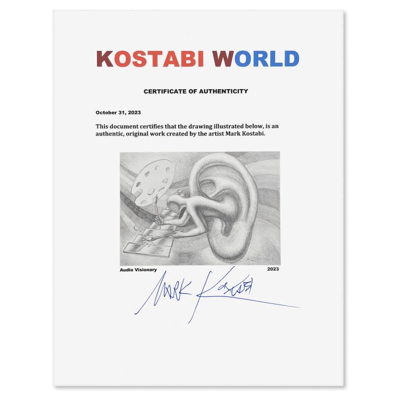 "Audio Visionary" is an original drawing on paper by Mark Kostabi, hand signed by the artist. This piece comes custom framed and includes a certificate of authenticity. Measures approximately 14" x 17.5" (frame), 8" x 11.5" (image). This item requires special handling and may have a longer than usual turnaround.