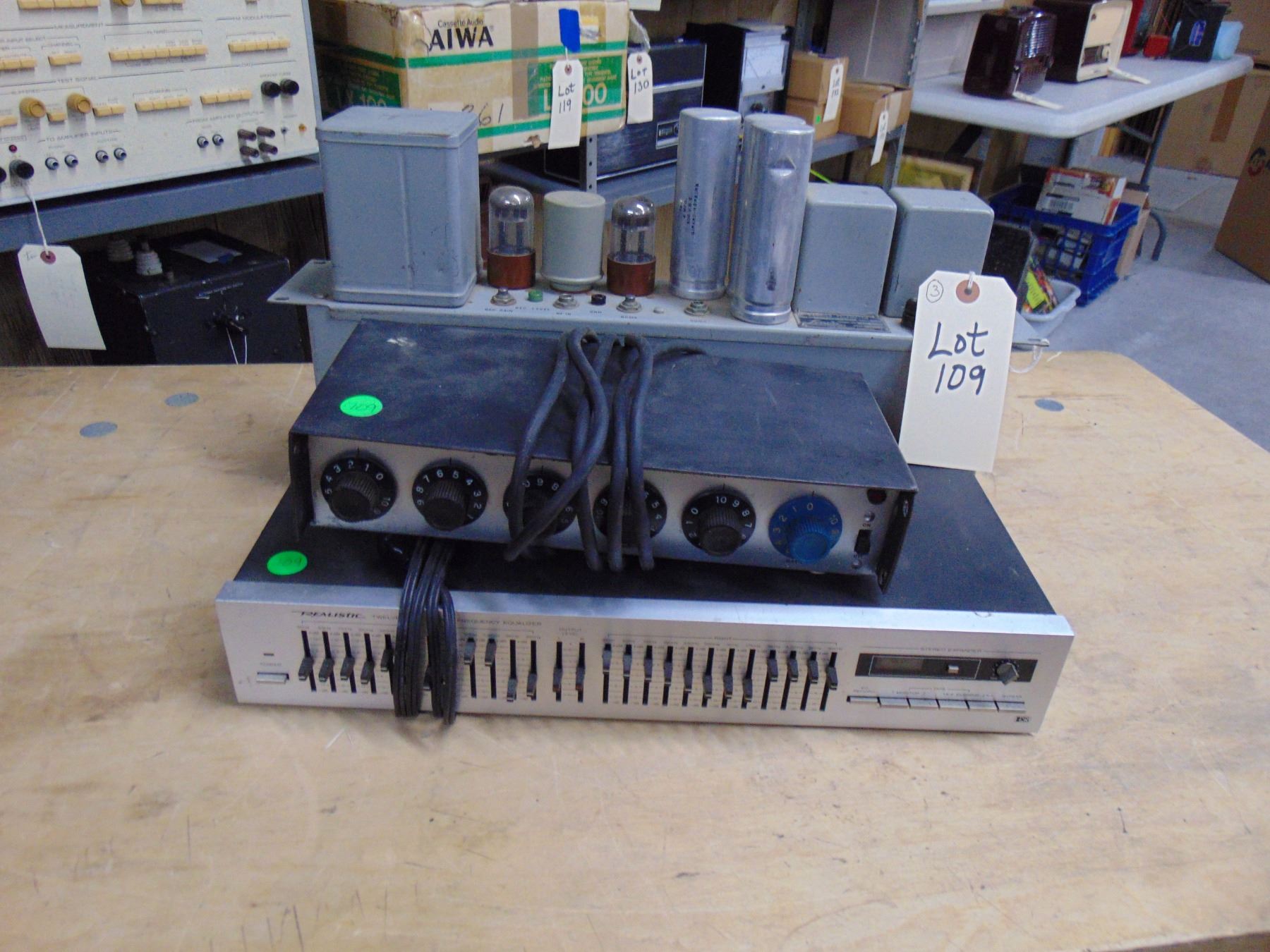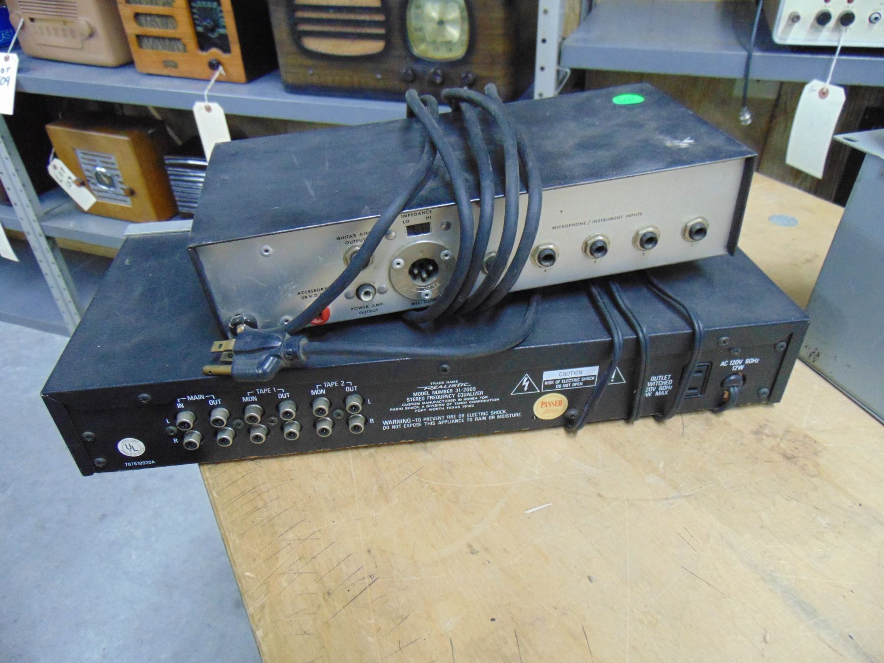 3 items; Lynch carrier telemeter, model 2; Shure microphone/instrument mixer, model PE68M; Realistic 12 band stereo frequency equalizer, model 31-2009