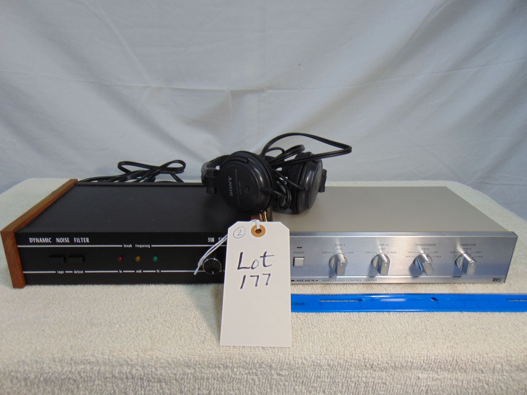 Three items: 1) Sony headphones, model MDR-V250; 2) Archer video/audio control center; 3) Dynamic noise filter