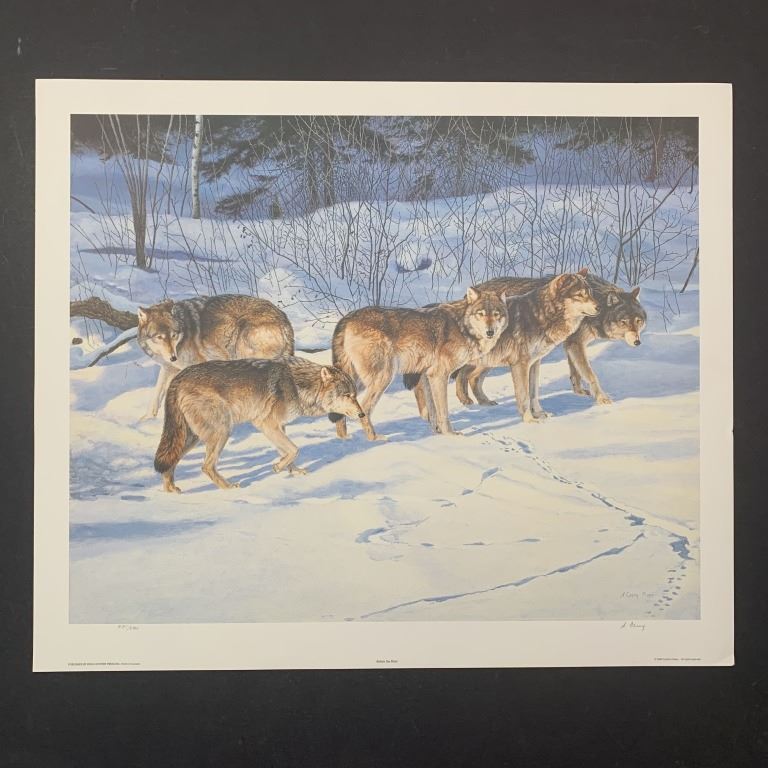 Audrey Casey's "Before the Hunt" limited edition print, signed lower right and numbered 481/500 lower left. This piece is of a pack of wolves in winter, getting ready to go on a hunt. This piece is in excellent condition