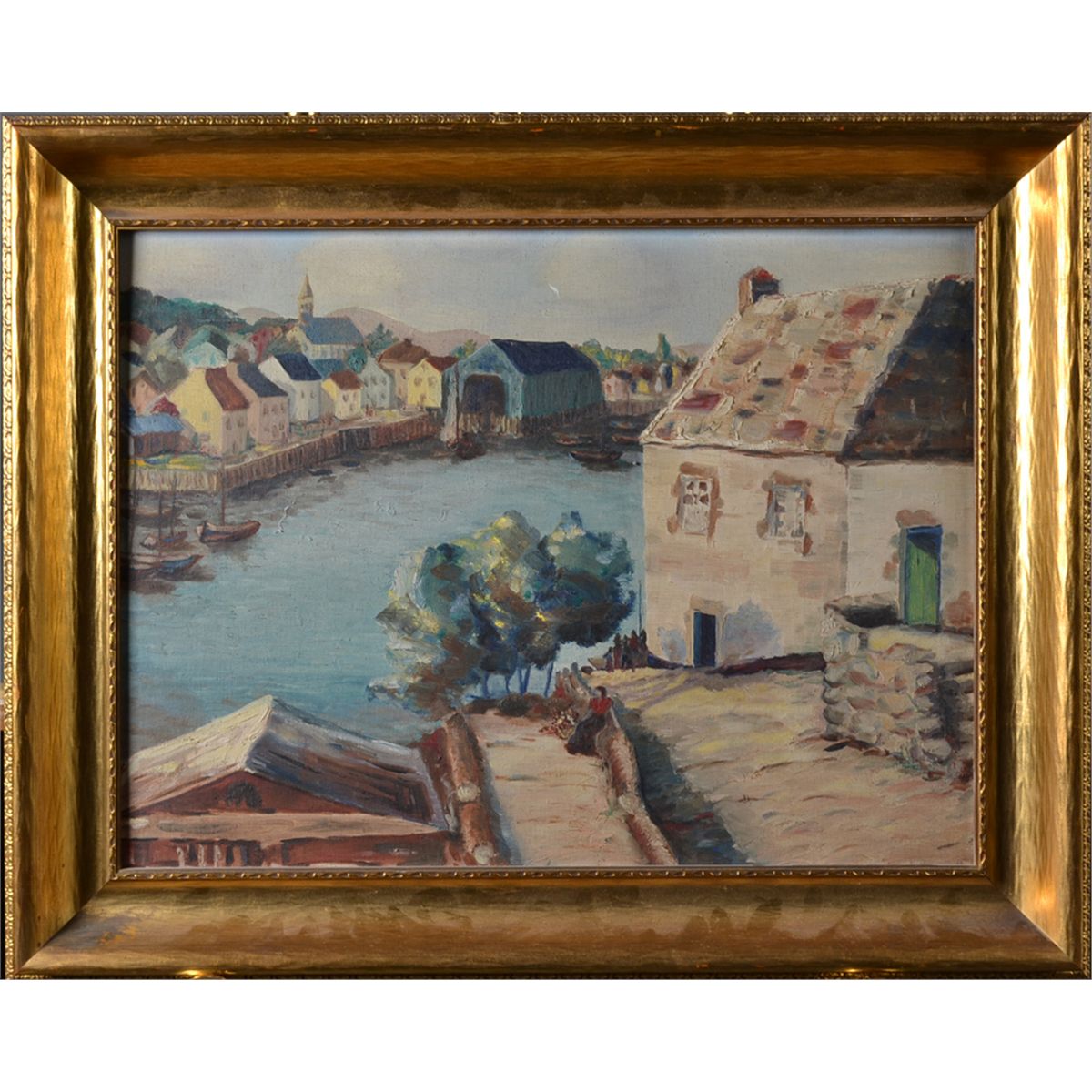 Painted to depict a harbor scene with village surrounding town river. Signed LR. Framed in a gilded carved wood frame. 17.25" H x 23.5" W, sight, 23.25" H x 29.5" W, framed. Circa 20th century. Private collection Bloomfield Hills, MI.