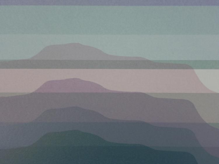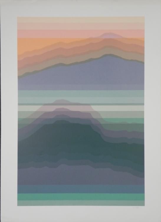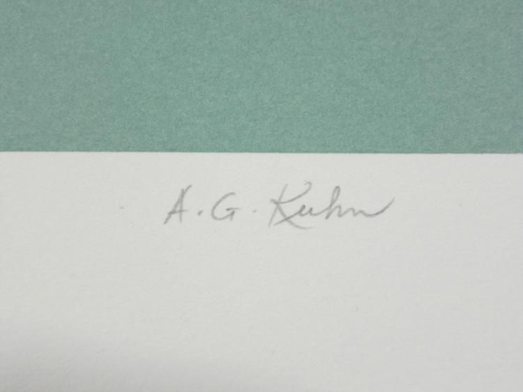 This is a layered mountainous landscape in cool pastel hues. * * Artist: Audrey Grendahl Kuhn Signature: In pencil, lower right (A.G. Kuhn) Medium: Serigraph on Rives paperSheet size: 29 x 40 inches Condition: Very good; minor margin creasing- could be matted outBiography: * Audrey Grendahl Kuhn (1929- ) was born in Chicago, and studied art at the University of Michigan, the College of Architecture and Design, Russell Sage College and the College of St. Rose in Albany, New York. Her pastel landscapes and modern still lifes reflect the energy of their subjects with soft yet bright colors. Her work drew much attention at the New York Art Expo in the 1980's. Later, she spent the winter months in Mexico, where she drew new inspiration from the vibrant scenery. She has since won awards, and is listed in "Who's Who in American Art". Her art can be found in many galleries and corporate and private collections throughout the U.S. and the world. *