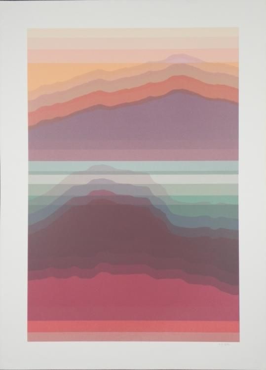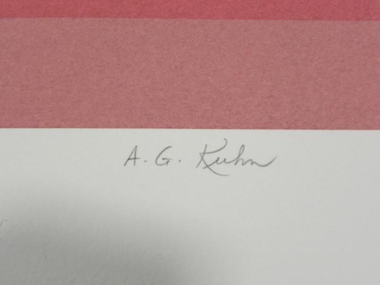 Here is a mountainous landscape layered in warm pastel hues. Artist: Audrey Grendahl Kuhn Signature: In pencil, lower right (A.G. Kuhn) Medium: Serigraph on Rives paperSheet size: 29 x 40 inches Condition: Very good; minor margin creasing- could be matted outBiography:Audrey Grendahl Kuhn (1929- ) was born in Chicago, and studied art at the University of Michigan, the College of Architecture and Design, Russell Sage College and the College of St. Rose in Albany, New York. Her pastel landscapes and modern still lifes reflect the energy of their subjects with soft yet bright colors. Her work drew much attention at the New York Art Expo in the 1980's. Later, she spent the winter months in Mexico, where she drew new inspiration from the vibrant scenery. She has since won awards, and is listed in "Who's Who in American Art". Her art can be found in many galleries and corporate and private collections throughout the U.S. and the world.