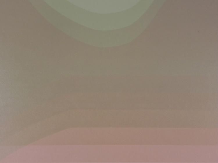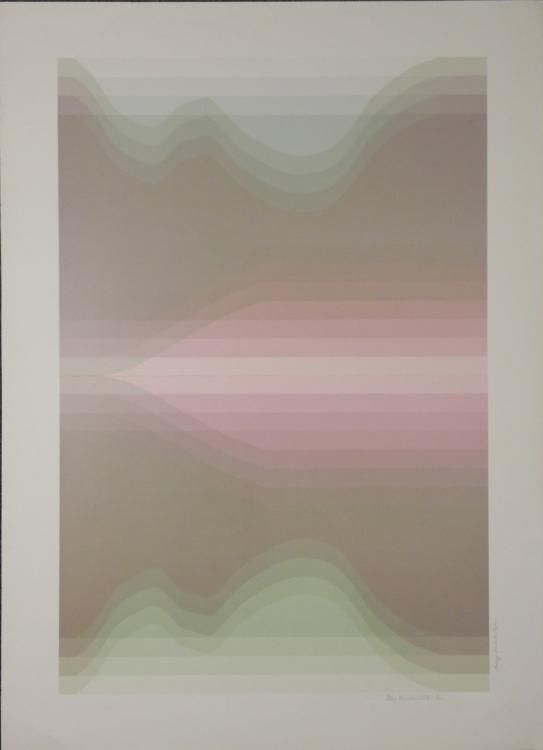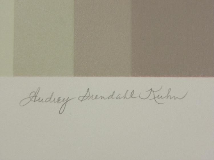 This print portrays a pink lake set amidst blue green mountains, all in shimmering pastel layers. * Artist: Audrey Grendahl Kuhn Signature: In pencil, lower right Title: "Blue Mountain Lake One"Edition: Unnumbered- possibly a proofMedium: Serigraph on paperSheet size: 29 x 40 inches Condition: Very good; minor margin creasing- could be matted outBiography: * Audrey Grendahl Kuhn (1929- ) was born in Chicago, and studied art at the University of Michigan, the College of Architecture and Design, Russell Sage College and the College of St. Rose in Albany, New York. Her pastel landscapes and modern still lifes reflect the energy of their subjects with soft yet bright colors. Her work drew much attention at the New York Art Expo in the 1980's. Later, she spent the winter months in Mexico, where she drew new inspiration from the vibrant scenery. She has since won awards, and is listed in "Who's Who in American Art". Her art can be found in many galleries and corporate and private collections throughout the U.S. and the world. *