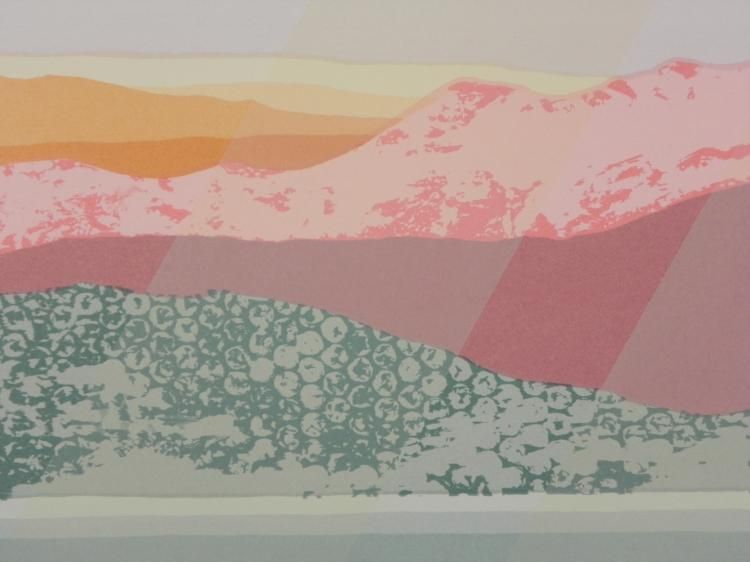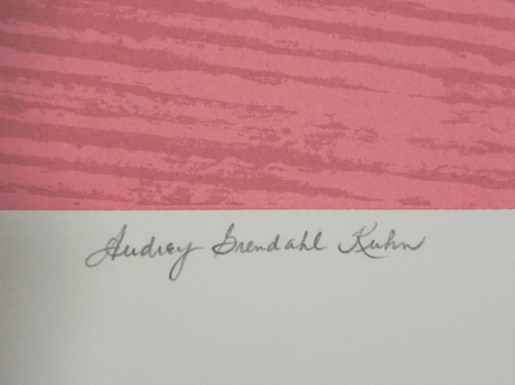 A river on a desert landscape is portrayed here in defined layers and textures. Artist: Audrey Grendahl Kuhn Signature: In pencil, lower right Title: "Blue Waterway One"Edition: Numbered from a limited edition of 80Medium: Serigraph on paperSheet size: 29 x 40 inches Condition: Very good; minor margin creasing- could be matted outBiography:Audrey Grendahl Kuhn (1929- ) was born in Chicago, and studied art at the University of Michigan, the College of Architecture and Design, Russell Sage College and the College of St. Rose in Albany, New York. Her pastel landscapes and modern still lifes reflect the energy of their subjects with soft yet bright colors. Her work drew much attention at the New York Art Expo in the 1980's. Later, she spent the winter months in Mexico, where she drew new inspiration from the vibrant scenery. She has since won awards, and is listed in "Who's Who in American Art". Her art can be found in many galleries and corporate and private collections throughout the U.S. and the world.
