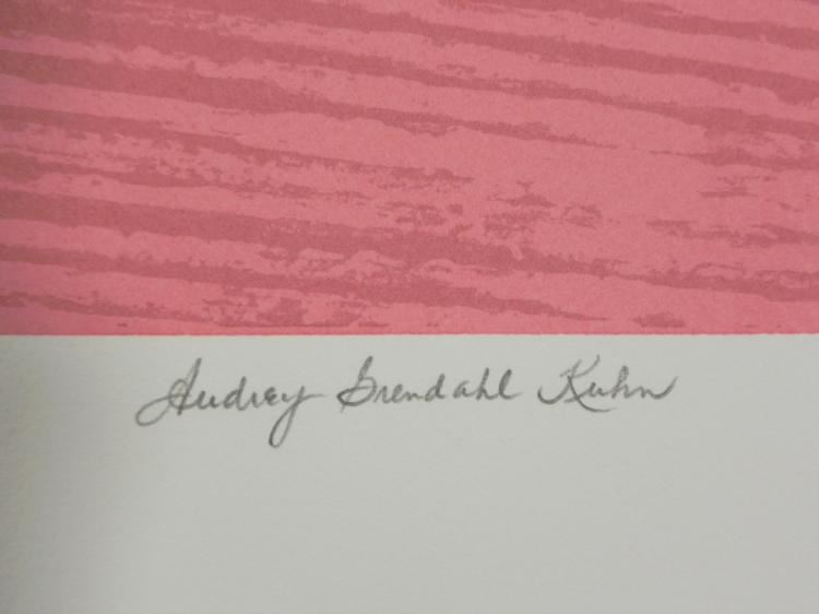 A river on a desert landscape is portrayed here in defined layers and textures. Artist: Audrey Grendahl Kuhn Signature: In pencil, lower right Title: "Blue Waterway One"Edition: Numbered from a limited edition of 80Medium: Serigraph on paperSheet size: 29 x 40 inches Condition: Very good; minor margin creasing- could be matted outBiography:Audrey Grendahl Kuhn (1929- ) was born in Chicago, and studied art at the University of Michigan, the College of Architecture and Design, Russell Sage College and the College of St. Rose in Albany, New York. Her pastel landscapes and modern still lifes reflect the energy of their subjects with soft yet bright colors. Her work drew much attention at the New York Art Expo in the 1980's. Later, she spent the winter months in Mexico, where she drew new inspiration from the vibrant scenery. She has since won awards, and is listed in "Who's Who in American Art". Her art can be found in many galleries and corporate and private collections throughout the U.S. and the world.