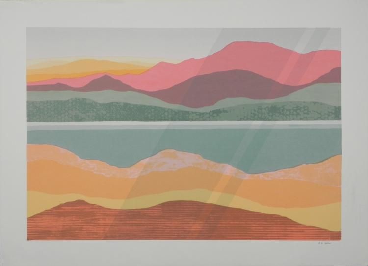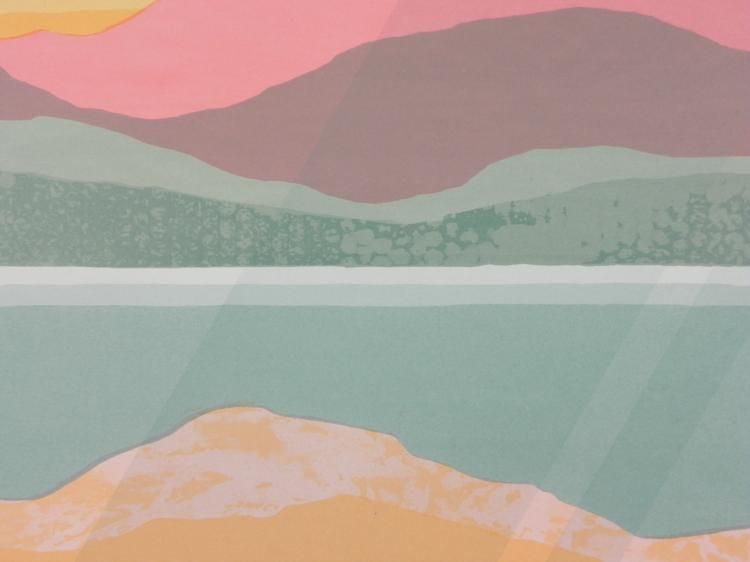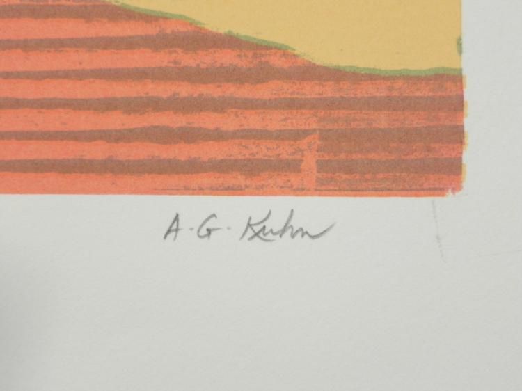 This desert landscape with vivid textures and a ray of sun looks like it belongs to a series by the artist titled "Blue Waterway," although this print is untitled. Artist: Audrey Grendahl Kuhn Signature: In pencil, lower right (A.G. Kuhn) Edition: Unnumbered- possibly a proofMedium: Serigraph on paperSheet size: 29 x 40 inches Condition: Very good; minor margin creasing- could be matted outBiography:Audrey Grendahl Kuhn (1929- ) was born in Chicago, and studied art at the University of Michigan, the College of Architecture and Design, Russell Sage College and the College of St. Rose in Albany, New York. Her pastel landscapes and modern still lifes reflect the energy of their subjects with soft yet bright colors. Her work drew much attention at the New York Art Expo in the 1980's. Later, she spent the winter months in Mexico, where she drew new inspiration from the vibrant scenery. She has since won awards, and is listed in "Who's Who in American Art". Her art can be found in many galleries and corporate and private collections throughout the U.S. and the world.