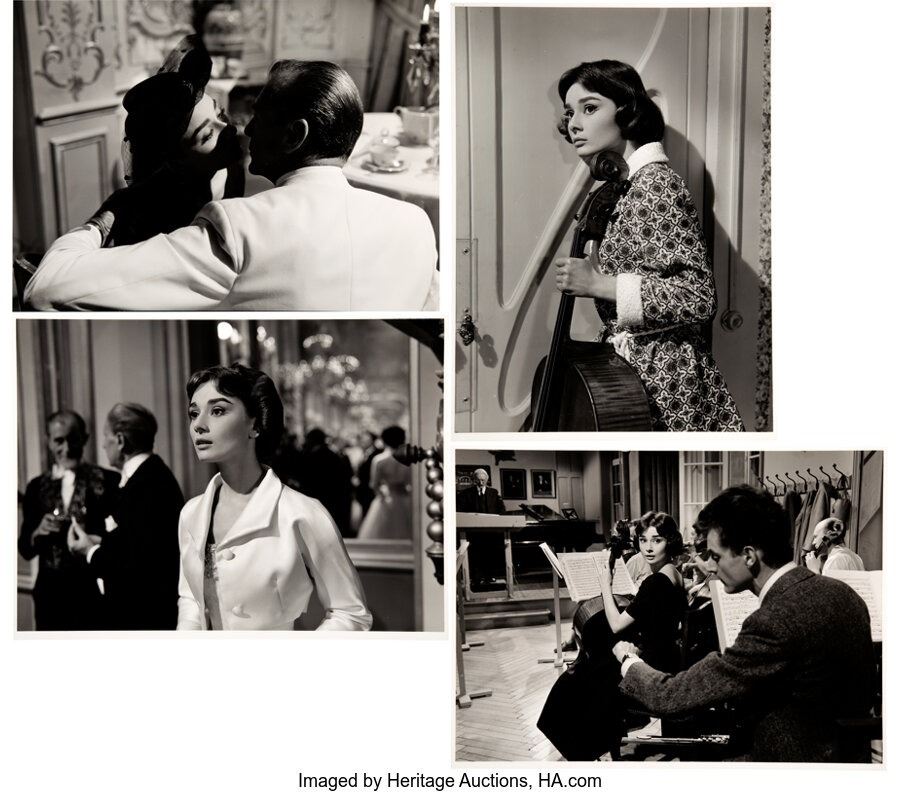 Audrey Hepburn OwnedLove in the AfternoonPhotos (4).Four large and gorgeous photos from Love in the Afternoon, owned by its star, Audrey Hepburn. All were taken during filming in Paris circa 1956. Includes: 1)This 15.5" x 11.5" matte-finish silver gelatin photo shows the highly photogenic Hepburn playing the cello during a scene from the film. With Christie's stamp and numerical notation in pencil to verso. Near Fine condition; 2)This 15.5" x 11.5" matte-finish silver gelatin photo shows Hepburn during a scene from the film. With Christie's stamp and numerical notation in pencil to verso. Near Fine condition; 3)This 11.5" x 15.5" matte-finish silver gelatin photo shows the Hepburn eavesdropping on a conversation. With Christie's stamp and numerical notation in pencil to verso. Discreet spotting at upper left, otherwise Near Fine condition; 4)This 15" x 11" matte-finish silver gelatin photo shows Hepburn as she embraces Gary Cooper, who's partly eclipsed by a play of shadows. With Christie's stamp and numerical notation in pencil to verso. Near Fine condition.