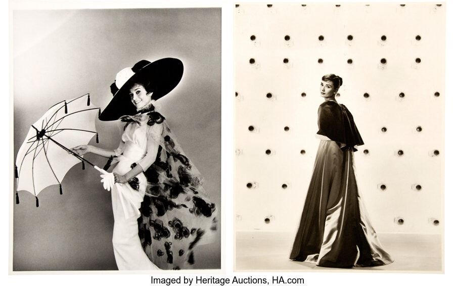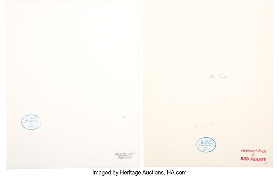 2)A beautiful silver gelatin print of Hepburn from the 1957 musical Funny Face. Photographer Bud Fraker, whose photographs of Hepburn from Roman Holidayand Sabrinalaunched his career, captured this image, showing Hepburn outfitted in evening gown and capelet, glancing over her shoulder. Printed on semi-matte double weight paper. With stamps from Christie's and "Paramount Photo By Bud Fraker" to verso. Near Fine condition. COA from Heritage Auctions.