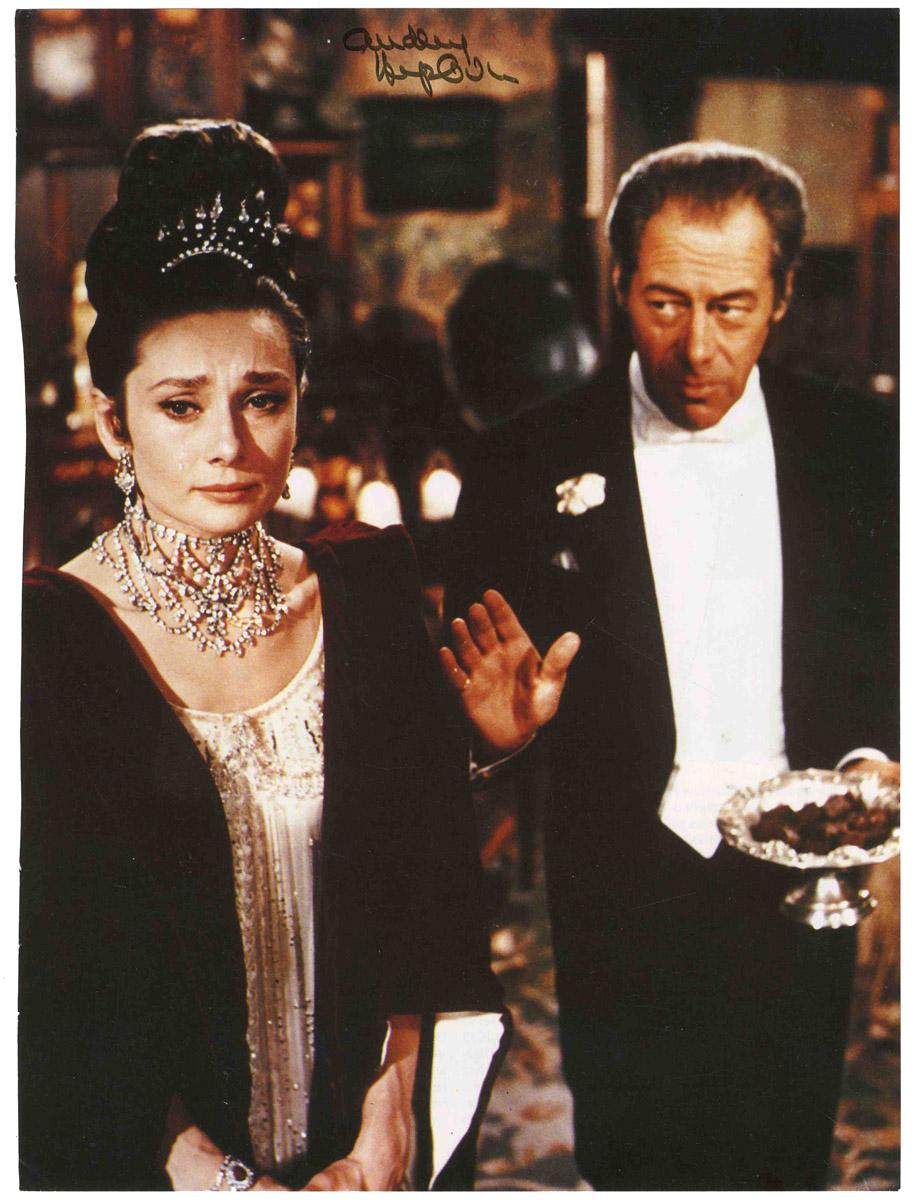 Signed color photo of Audrey Hepburn playing Eliza Doolittle in the musical ''My Fair Lady.'' The photo was cut out of the book, ''The Best of Warner Bros.'' and is signed with a black felt tip pen at top center ''Audrey Hepburn''. Measuring 9'' x 11.75'' with uneven trimming on left side, else fine.