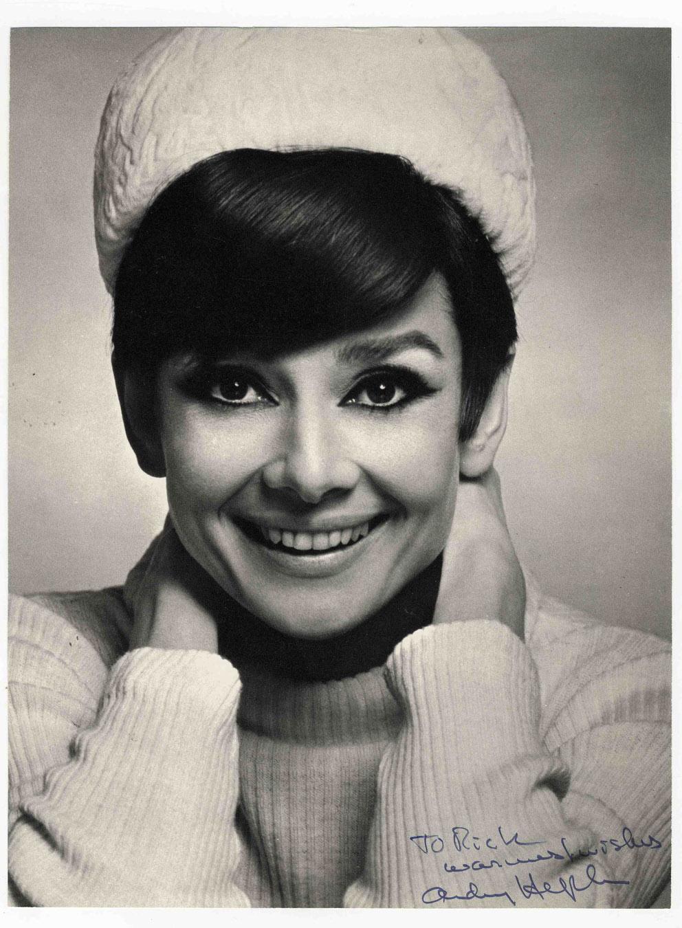Audrey Hepburn signed magazine photograph, inscribed ''To Rick / warmest wishes / Audrey Hepburn.'' Black and white photograph on thick matte magazine paper, perhaps from a program or picture book. Verso of photo shows images of Warren Beatty and Clint Eastwood. Photograph measures 8.5'' x 11'' and is in fine condition.