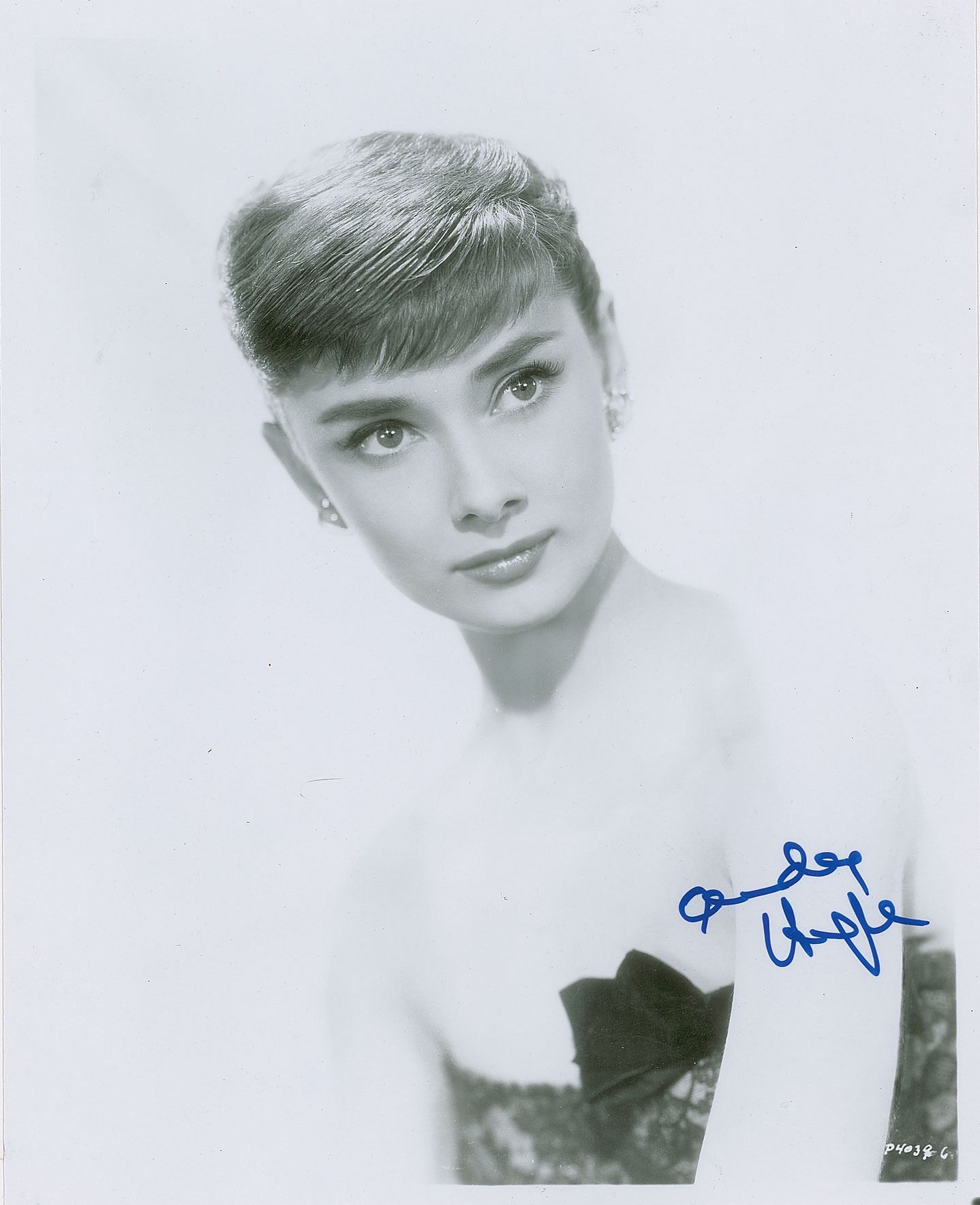 Gorgeous glossy 7.75 x 9.75 photo of Audrey Hepburn used as a publicity still for the 1957 musical romantic comedy Funny Face, signed in blue felt tip. In fine condition, with a few small surface creases.