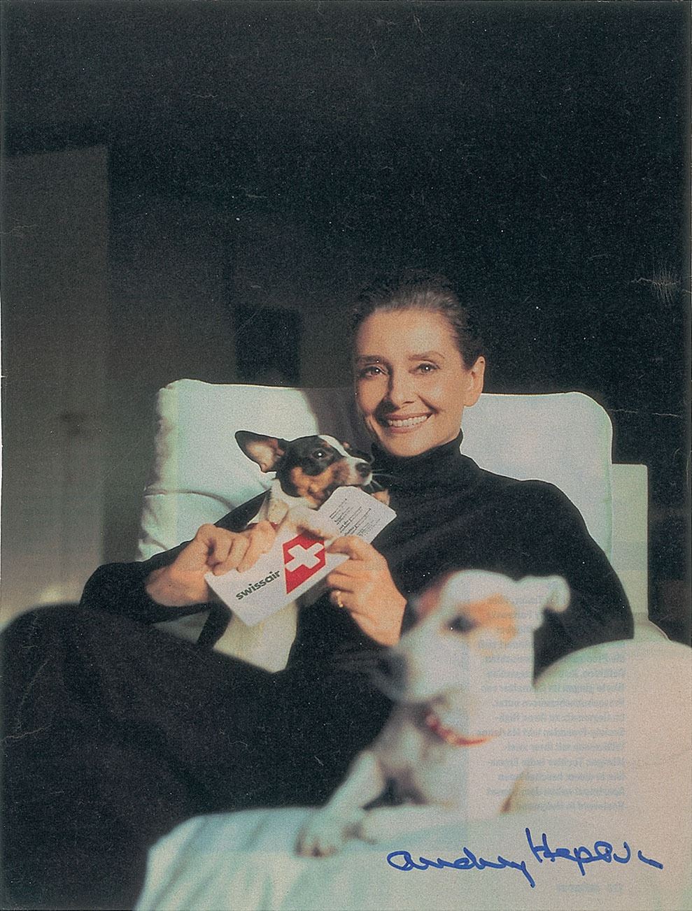Color semi-glossy 8.25 x 11 magazine photo of a Swissair advertisement showing Audrey Hepburn posing with her Jack Russell terriers, signed in blue felt tip. In very good to fine condition, with a long diagonal crease across the upper background area.