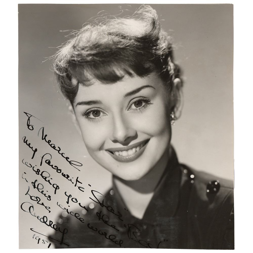 Rare vintage glossy 6.5 x 7.5 photo of the young Audrey Hepburn in an attractive head-and-shoulders pose, boldly signed and inscribed in fountain pen, "To Marcel, my favorite 'Star,' wishing you the best in this wide world, Love, Audrey, 1951.‰Û Reverse bears Associated British Picture Corporation Ltd. credit stamps. In very good to fine condition, with trimmed edges (slightly cropping the "t" in "Best") and light surface scuffing. It was not until 1953's Roman Holiday that Hepburn found her first starring role, making this a very early portrait of the aspiring star.