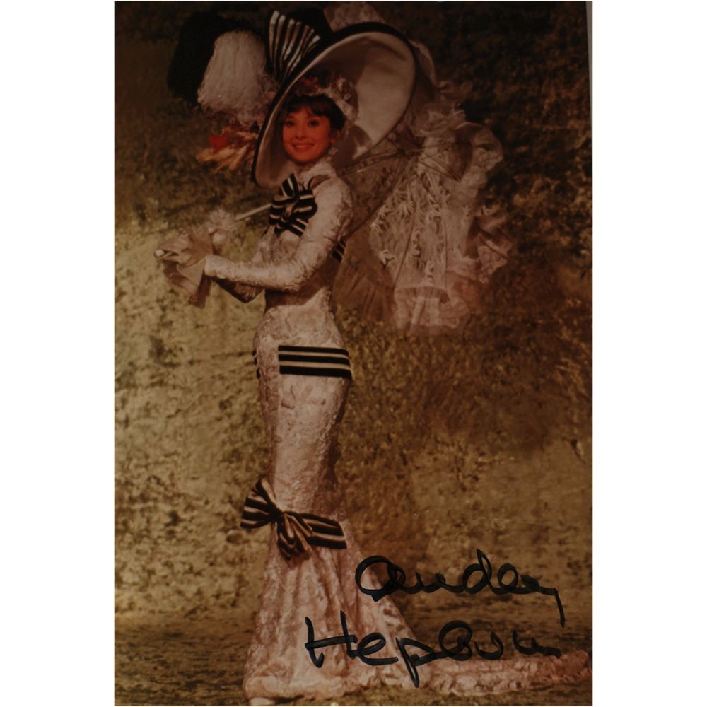 Color glossy 3.5 x 5 photo of Audrey Hepburn in her iconic role as Eliza Doolittle in My Fair Lady, signed in black felt tip. In fine condition.