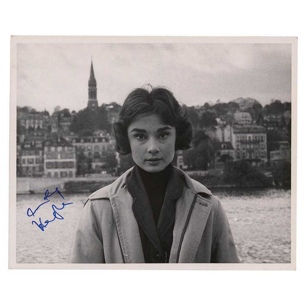 Exquisite glossy 10 x 8 half-length photo of Audrey Hepburn wearing a double-bun hairstyle, staring directly into the camera, and posing against a river backdrop lined with houses and a steeple, signed in blue felt tip. In fine condition, with some small creases and surface impressions. An unusual and strikingly beautiful picture of the adored actress.