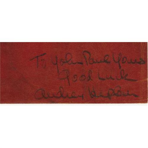 <B>Audrey Hepburn Signed Picture.</B></I> A 10" x 14" color magazine page featuring a gorgeous close-up of Hepburn, inscribed "To John Paul Jones, good luck" and signed by the actress in black ink. In Very Fine condition with regular mild wear, wrinkling, and a small nick and a few very small tears around the edges. <I>Accompanied by LOA from PSA/DNA.</B></I><BR><BR><b>Shipping:</b> Flat Material, Small (<a target="_blank" href="http://www.heritageauctions.com/common/shipping.php">view shipping information</a>)