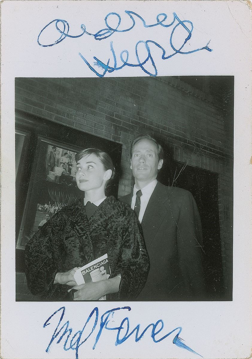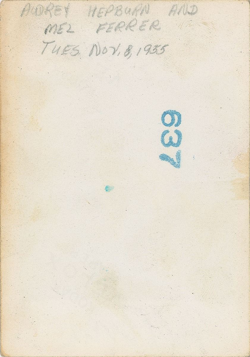 Wonderful vintage glossy 2.5 x 3.5 candid photo of husband-and-wife duo Audrey Hepburn and Mel Ferrer, both signing in blue ink, with Hepburn signing in the upper border, and Ferrer in the lower border. Reverse bears a collector’s date notation of November 8, 1955. In very good to fine condition, with slight creasing. From the Harvey and Rhoda Kuflik Collection.