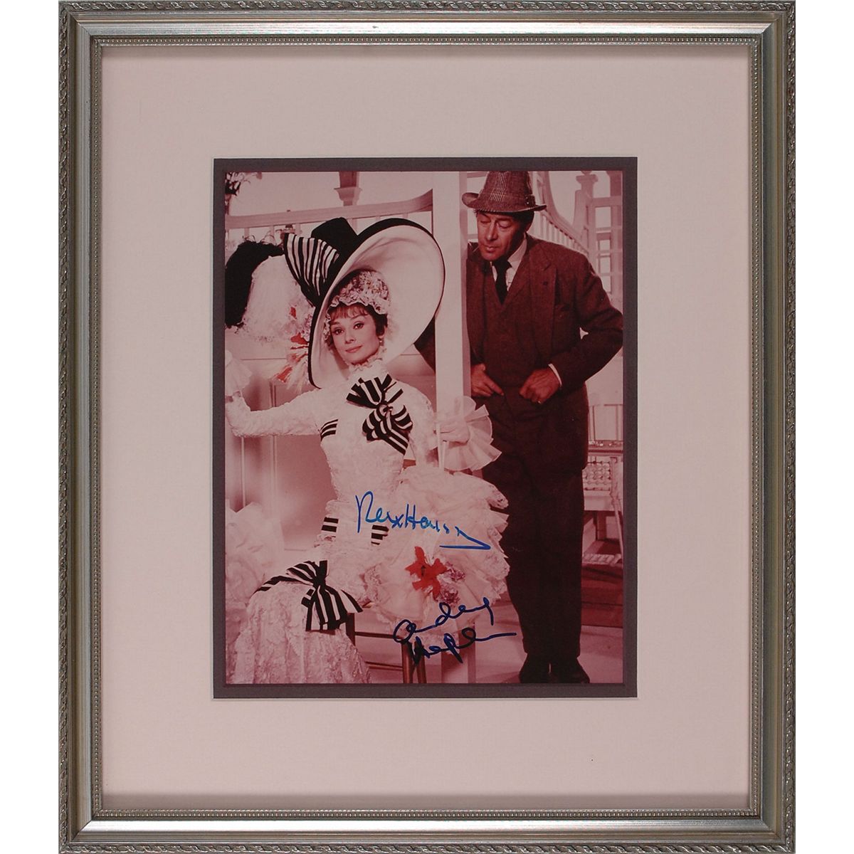 Timeless color glossy 8 x 10 photo from the classic My Fair Lady, signed in blue felt tip, “Audrey Hepburn,” and “Rex Harrison.” Double-matted and framed to an overall size of 13.25 x 15.25. In fine condition.