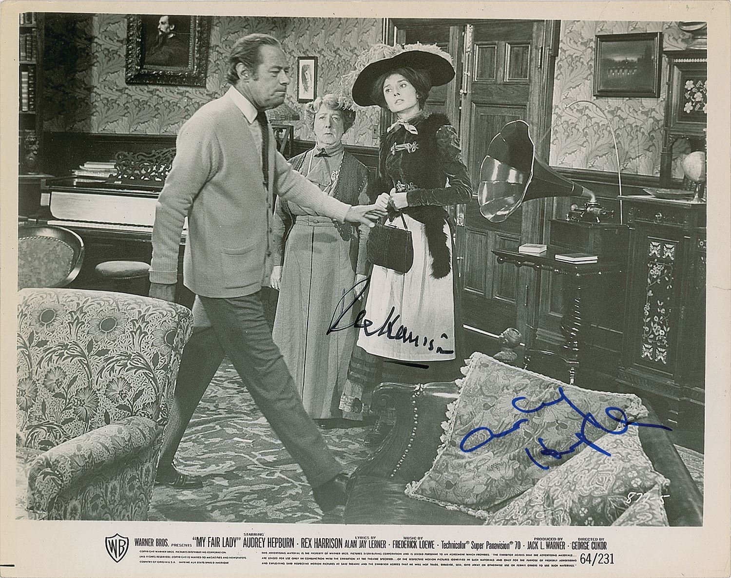 Glossy 10 x 8 Warner Bros. publicity still photo of the 1964 film My Fair Lady, signed in blue felt tip by Hepburn and in black felt tip by Harrison. Reverse bears a Movie Star News credit stamp. In fine condition.