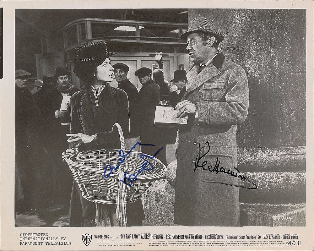 Glossy 10 x 8 Warner Bros. publicity still photo of Eliza Doolittle and Professor Henry Higgins from the 1964 film My Fair Lady, signed in blue felt tip by Hepburn and in black felt tip by Harrison. Reverse bears a Movie Star News credit stamp. In fine condition, with some light scratches to the emulsion.