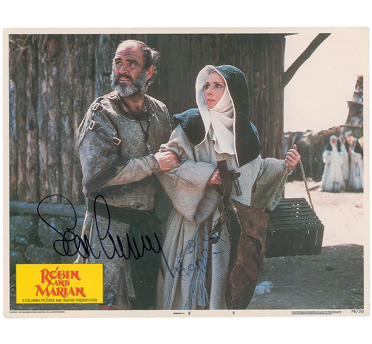 Fantastic color 14 x 11 lobby card for the 1976 film Robin and Marian, signed in blue felt tip by Audrey Hepburn and black felt tip by Sean Connery. Reverse bears an ink stamp from the ‘Socci Collection.’ A light horizontal bend passing through the upper portion and dings to corner tips, otherwise fine condition. Hepburn’s sons helped convince her to take the part in this Robin Hood adaptation so she could act beside ‘James Bond.’ A wonderful, uncommon pairing of two cinema legends.