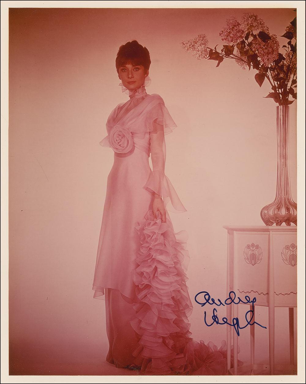 Lovely color glossy 8 x 10 full-length photo of Hepburn, circa My Fair Lady, signed in blue felt tip. In very fine condition.