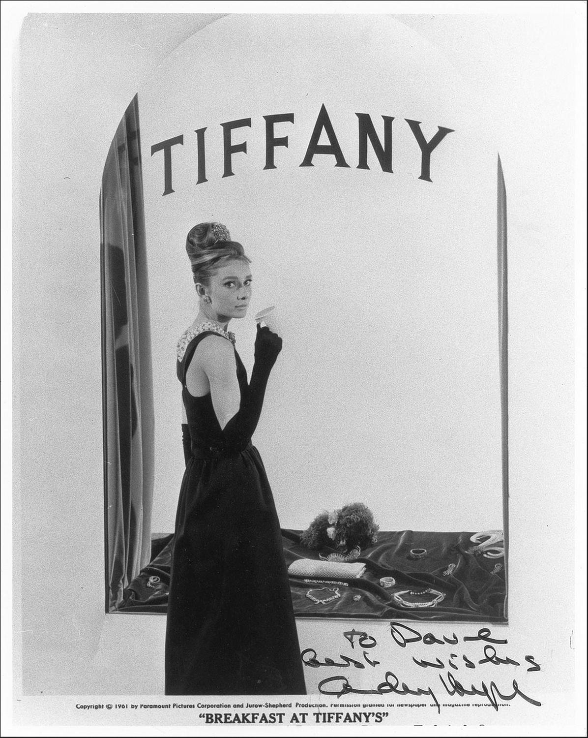 Glossy 8 x 10 second-generation promotional photo of Hepburn as she appeared in Breakfast at Tiffany’s, signed and inscribed in black felt tip “To Dave, best wishes, Audrey Hepburn.” In fine condition, with a couple minor surface dings to background.