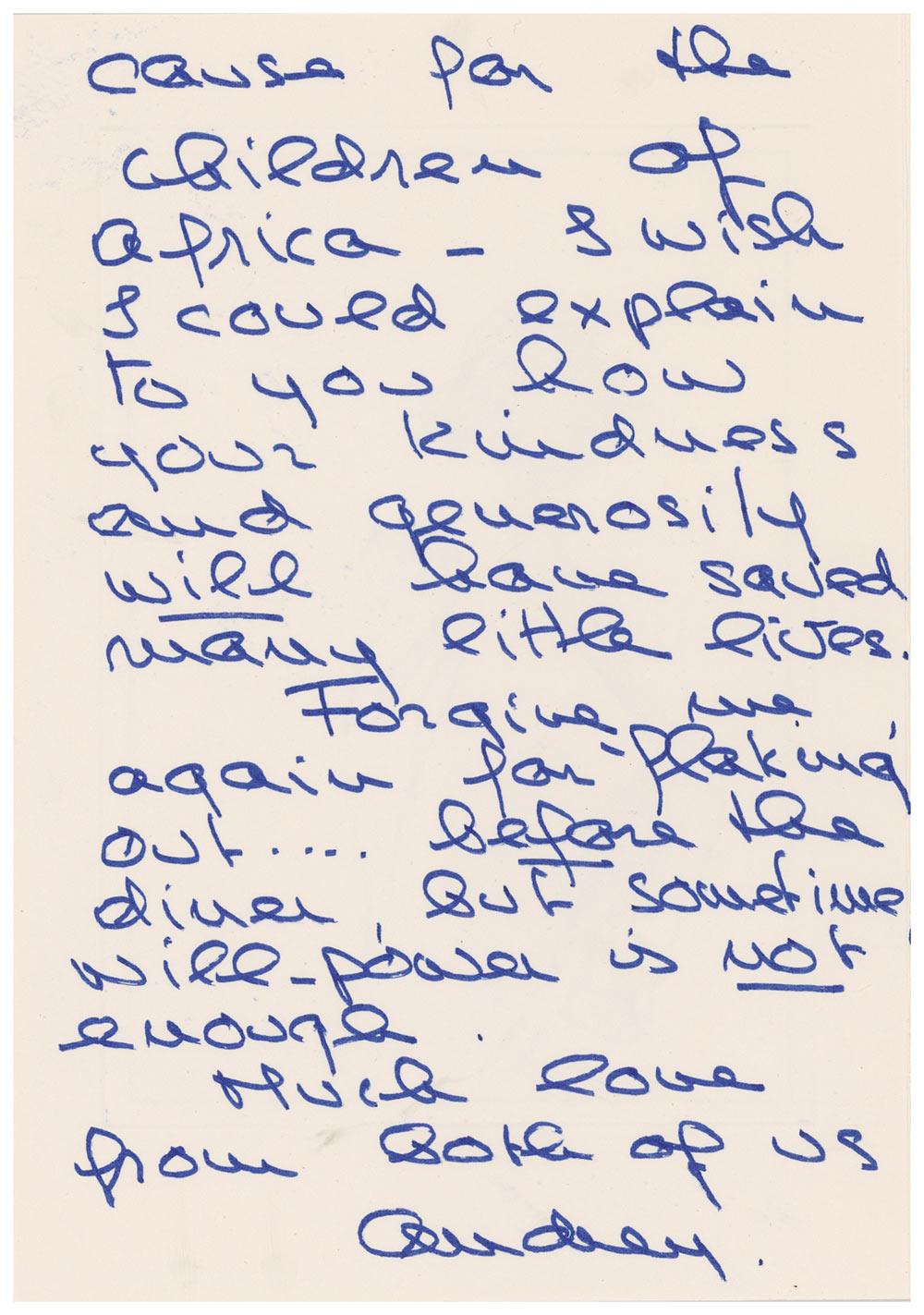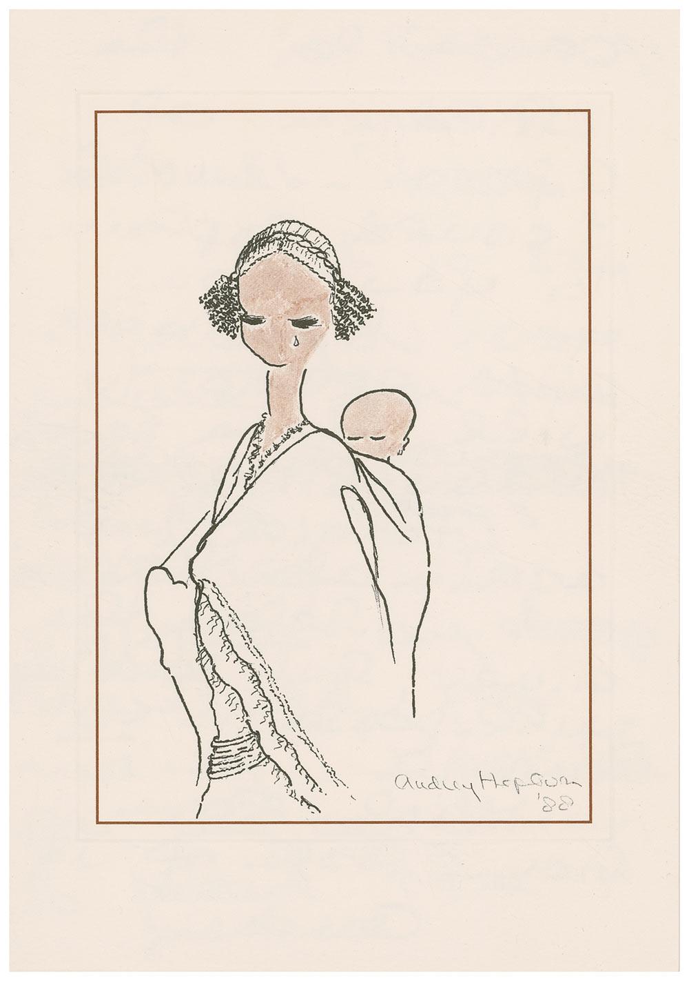 ALS signed “Audrey,” two pages on the inside panels of one of her 5.25 x 7.5, Hepburn designed UNICEF greeting cards, June 16, 1991. Letter to Steve Forrest, who included her as a presenter on the 1991 Tony Awards broadcast. In full: “Just to say thank you once more for the experience of the ‘Tonys’ but also to express my deep gratitude for making it possible for me, and UNICEF, to plead the cause for the children of Africa–I wish I could explain to you how your kindness and generosity will have saved many little lives. Forgive me again for flaking out…before the diner [sic], but sometimes will-power is not enough. Much love from both of us.” In fine condition. Accompanied by the original mailing envelope addressed in Hepburn’s hand. A touching letter mentioning Hepburn’s long-time humanitarian work.