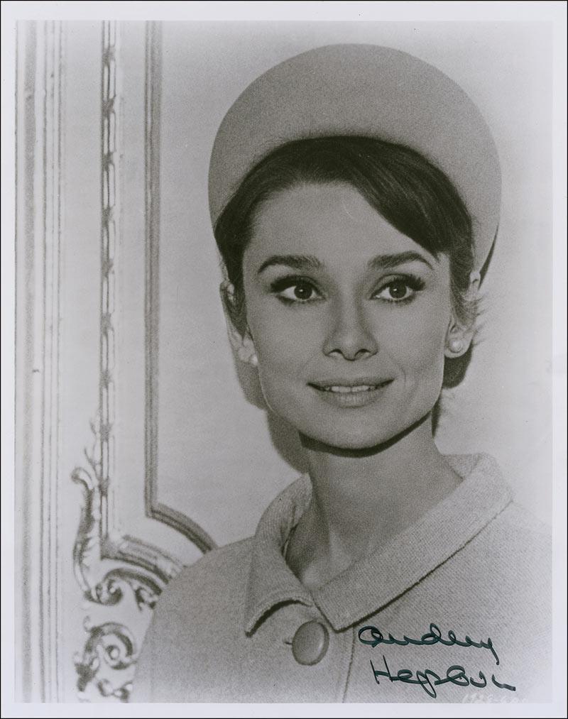 Glossy 8 x 10 photo of the actress as she appeared in Charade, signed in black felt tip. In fine condition, with a couple trivial bends.