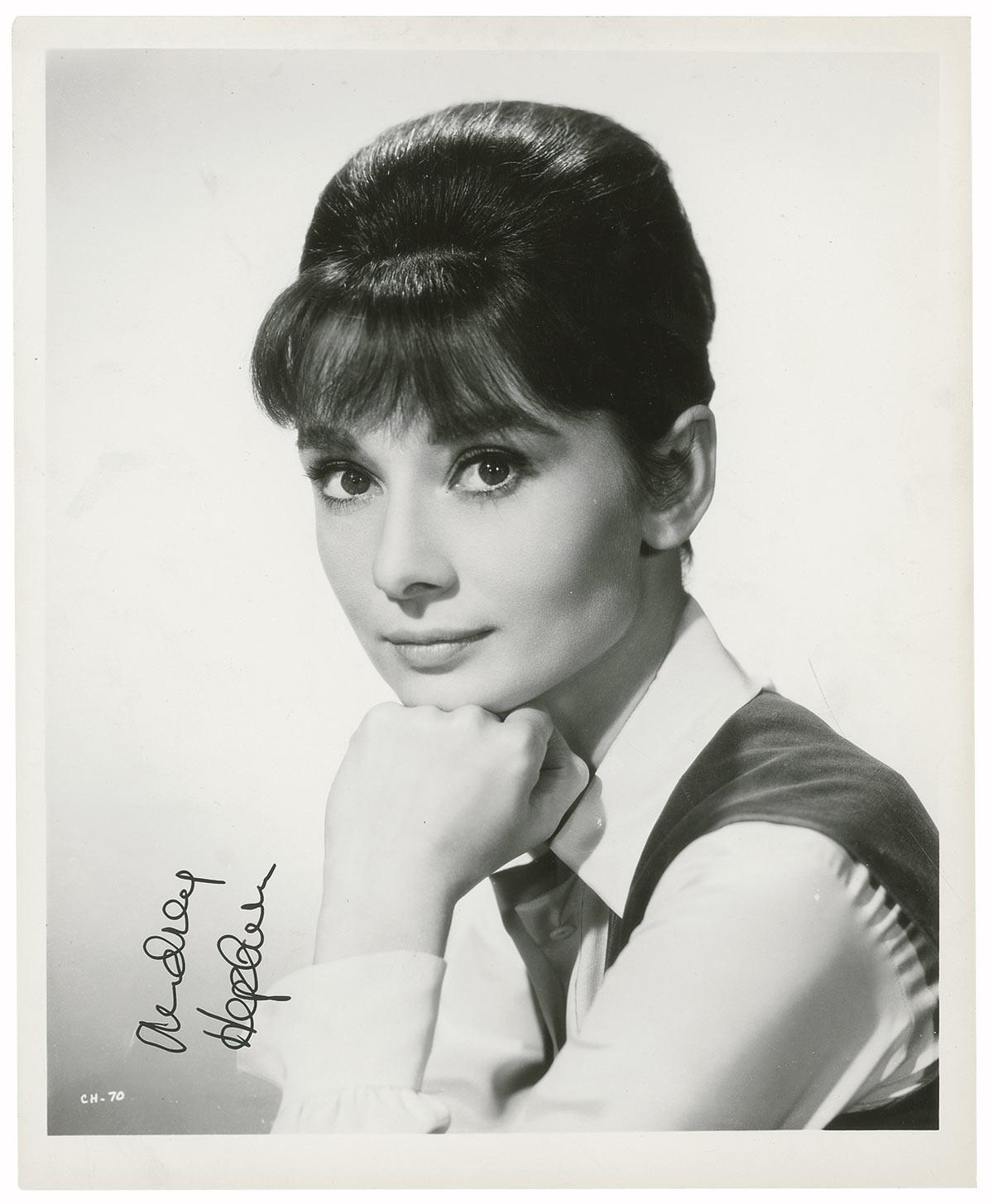 Adorable vintage glossy 8 x 10 photo of Hepburn resting her chin on her hand, signed vertically in fountain pen. Collector’s notation on reverse reads, “Audrey Hepburn - Regency Hotel - Friday, December 13, 1963.” In fine condition, with some mild border toning, and a few scattered light creases. Signed photos from this stage in Hepburn’s career are quite desirable.