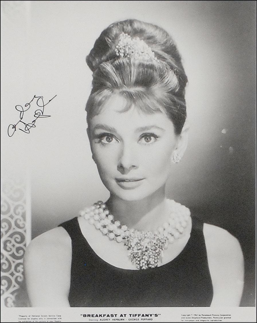 Glossy 8 x 10 Paramount promotional photo of Hepburn from Breakfast At Tiffany’s, signed in-person in black felt tip. Acid free double matted to an overall size of 12 x 14. In fine condition. Consignor notes signature was obtained on February 24, 1991 at the Renaissance Hotel as Hepburn was waiting for her bags. Accompanied by a letter of provenance from the photo’s original recipient.