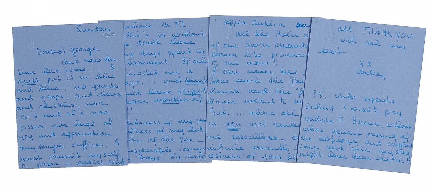 Incredible ALS signed “Audrey,” seven pages on four light blue sheets (on three pages she uses both sides), 6.25 x 8.25, no date but circa 1964. Hepburn writes legendary film director George Cukor. In part: “And now the time has come. I must put it in blue and blue, no grunts and gasps, and cheers and chuckles, nor oo’s and ah’s nor kisses nor hugs of joy and appreciation any longer suffice. I must commit myself to paper—easier said than done! Though you may have turned me into a ‘lidy’ and taught me to wash mi’ fice and ‘ands and to watch me P’s and H’s, and I do have feelin’s same as hanyone helse, that does not mean I have mastered the majesty of the English language. The BEST part of the whole M. F. L. [My Fair Lady] doin’s is without a doubt those precious days spent in your ‘basement.’ If only you’d invited me a year ago...The prettiness of my room, the softness of my bed, the glow of the fire—the unspeakable cosiness of our ‘trays’ by the fire, the thoughtfulness of each pencil and ashtray pillow and posy, the luxury of Ingrid the soundless sweetness of Myrtle, the dainty dishes derived by Ester, Silka’s soothing serving, Capy’s bottomless disposall [sic] adoration have spoiled me rotten and I not only any longer fit for Covent Garden…the infinite warmth and cosiness of your blowing in and out of my room…the constant care and fun of you and the immeasurable depths of your understanding not just of me but of the whole human race make you a treasure trove of a friend…what can I say after I’ve said ‘I love you.’ I shall add THANK YOU with all my heart. xx Audrey P.S. Under seperate [sic] billing I wish to pay tribute to Irene, without whos [sic] patiant [sic] passing of the telephone and constant care and ‘chic’ my stay might have been chaotic!!” In fine condition with a light horizontal mailing fold, some wrinkling, and a faint paperclip impression at the top of each page.