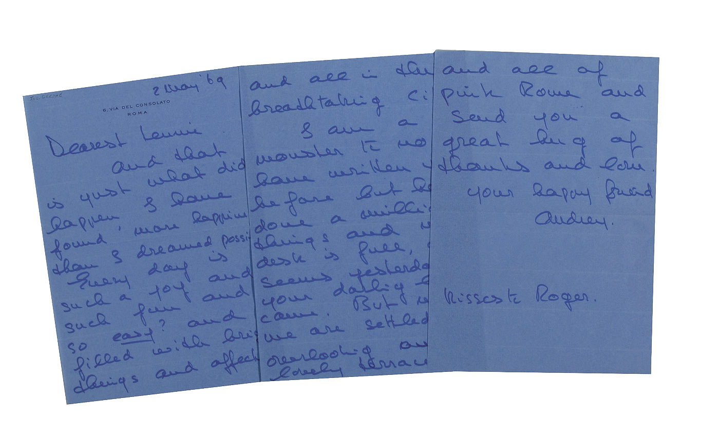 ALS signed “Audrey,” three light blue pages, 6 x 8.25, May 2, 1969. From Rome, Hepburn writes playwright, screenwriter, and lyricist Leonard Gershe. In full: “And that is just what did happen. I have found ‘more happiness than I dreamed possible.’ Every day is such a joy and such fun and so easy? and filled with bright things and affection and all in this breathtaking city. I am a monster to not have written you before but have done a million things and my desk is full, and seems yesterday your daily letter came. But now we are settled, and overlooking our lovely terrace and all of pink Rome and send you a great hug of thanks and love.” She has added the postscript “kisses to Roger” at the bottom of the third page. In fine condition with a light horizontal mailing fold, some wrinkling, and a faint collector notation in pencil at the upper left corner of the first page. Accompanied by the original mailing envelope addressed in her hand.