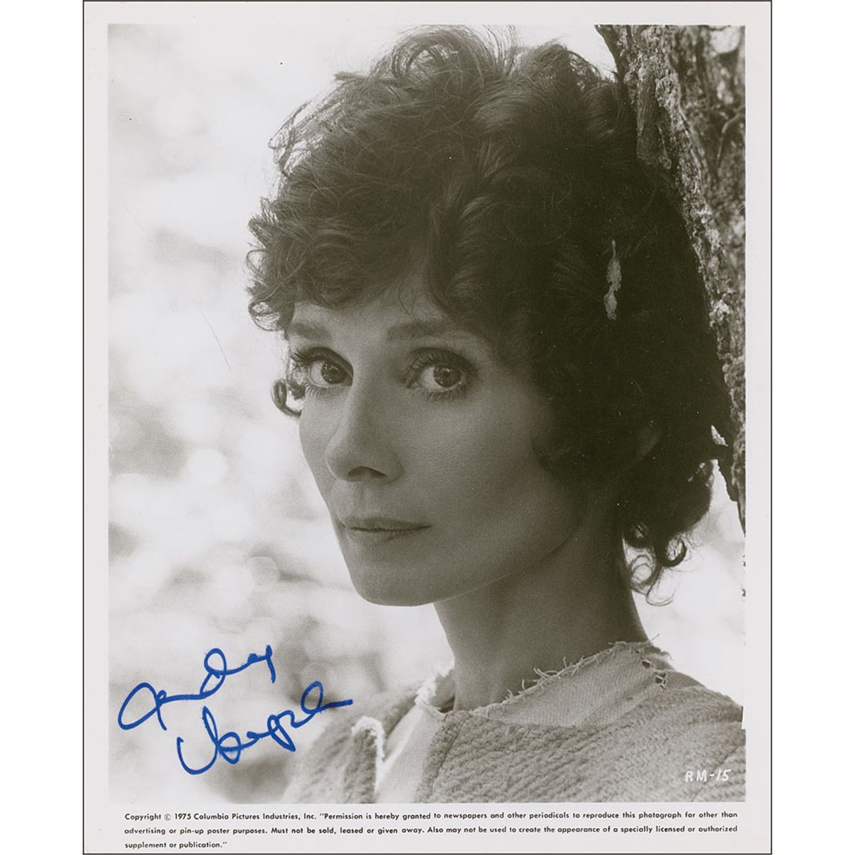 Glossy 8 x 10 Columbia Pictures publicity photo of Hepburn from Robin and Marion, signed in blue felt tip. Some scattered light creases and surface marks, and some light brushing to signature, otherwise fine condition. Accompanied by a letter of authenticity from James Spence.