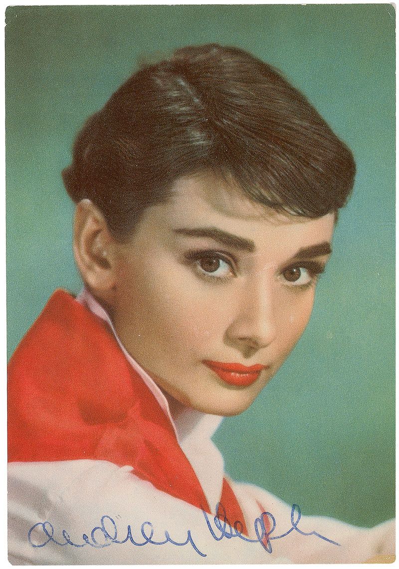 Color vintage 4 x 6 German postcard photo of a young Hepburn looking over her shoulder, signed in fountain pen. In fine condition, with a few light surface marks and creases and a bit of irregular ink adhesion to first name of signature.