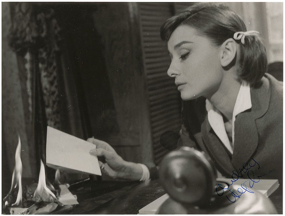Vintage glossy 9.25 x 7 photo of Hepburn in Love in the Afternoon, signed in fountain pen. In fine condition, with trimmed edges and a bit of light contrast to the signature.