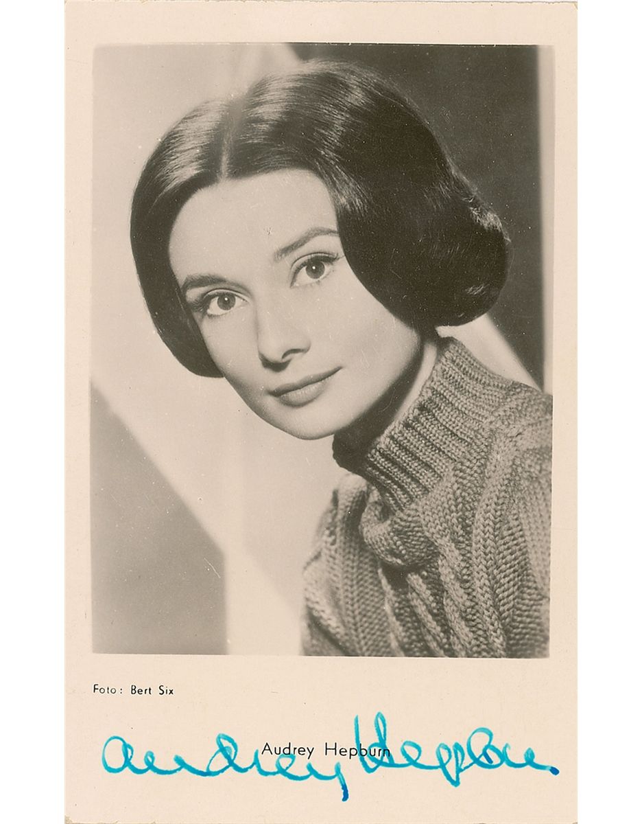 Stunning vintage 3.5 x 5.5 German real photo postcard of Hepburn featuring a portrait by Bert Six, nicely signed in the lower border in fountain pen. In fine condition.