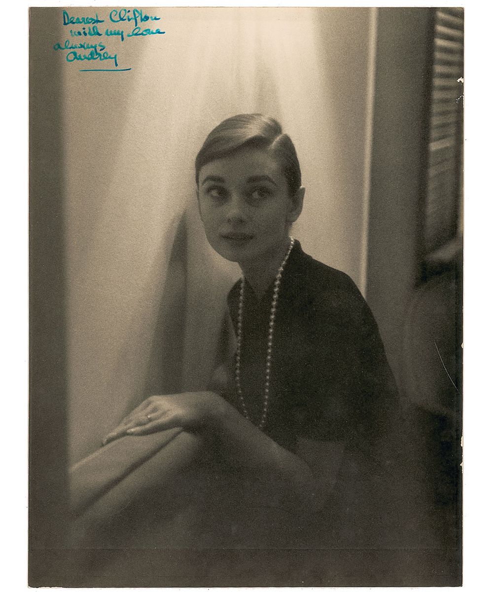 Vintage pearl-finish 7 x 9.25 photo, signed and inscribed in fountain pen, to noted actor Clifton Webb “Dearest Clifton, with my love always, Audrey.” In fine condition, with slightly trimmed edges and a few inconsequential creases to background.