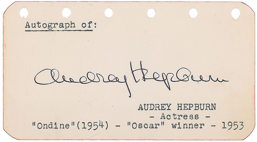 Terrific vintage fountain pen signature, “Audrey Hepburn,” on an off-white 4.5 x 2.5 page. In fine condition.