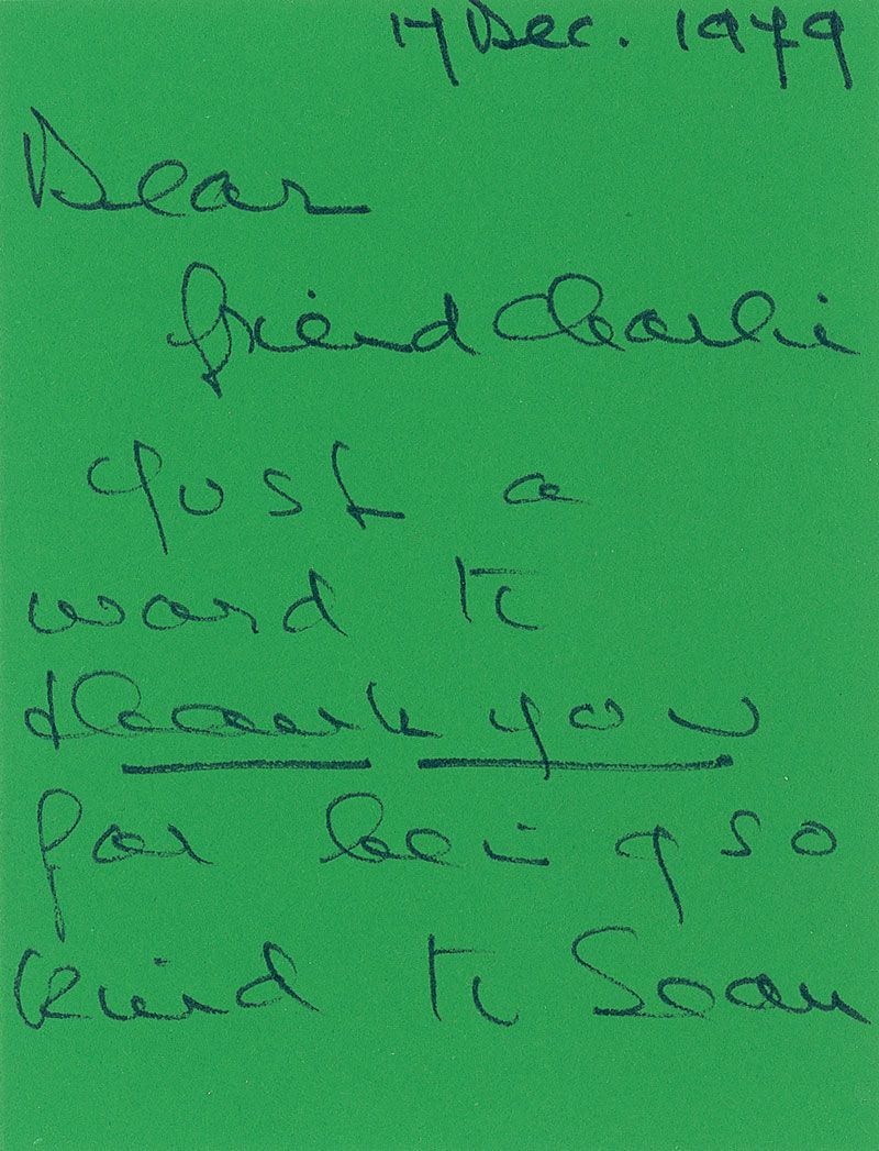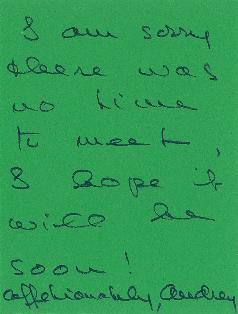 ALS signed “Audrey,” two pages on two adjoining sheets, 3.75 x 5, December 17, 1979. Letter to a friend. In full: “Just a word to thank you for being so kind to Sean. I am sorry there was no time to meet, & hope it will be soon!” In very fine condition. Accompanied by the original unmarked transmittal envelope.