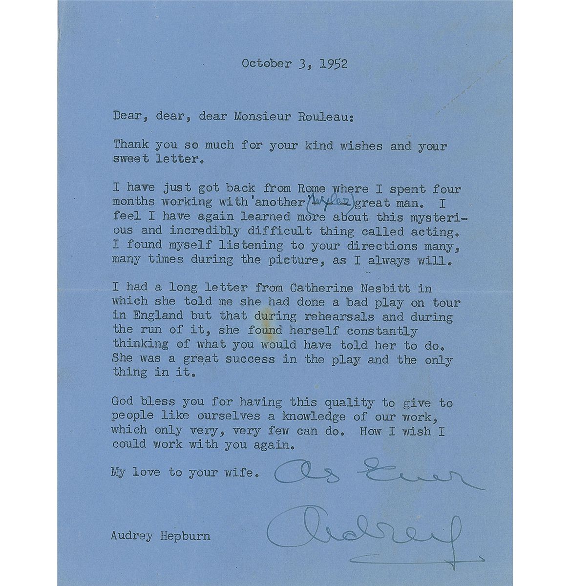 Superb TLS signed “As ever, Audrey,” one page, 5.25 x 7, October 3, 1952. Letter to Raymond Rouleau. In part: “I have just got back from Rome where I spent four months working with another (Wyler) great man. I feel I have again learned more about this mysterious and incredibly difficult thing called acting. I found myself listening to your directions many, many times during the picture, as I always will…God bless you for having this quality to give to people like ourselves a knowledge of our work, which only very, very few can do. How I wish I could work with you again.” A small stain to the center and staple holes to upper left, otherwise fine condition. Rouleau had been the director for the 1951 Broadway play Gigi, in which Hepburn played the lead role. Immediately after the play finished in the spring of 1952, Hepburn left for Rome to begin shooting Roman Holiday, directed by William Wyler—her first starring role in Hollywood. A wonderful early letter discussing her acting career and one of her most iconic films.
